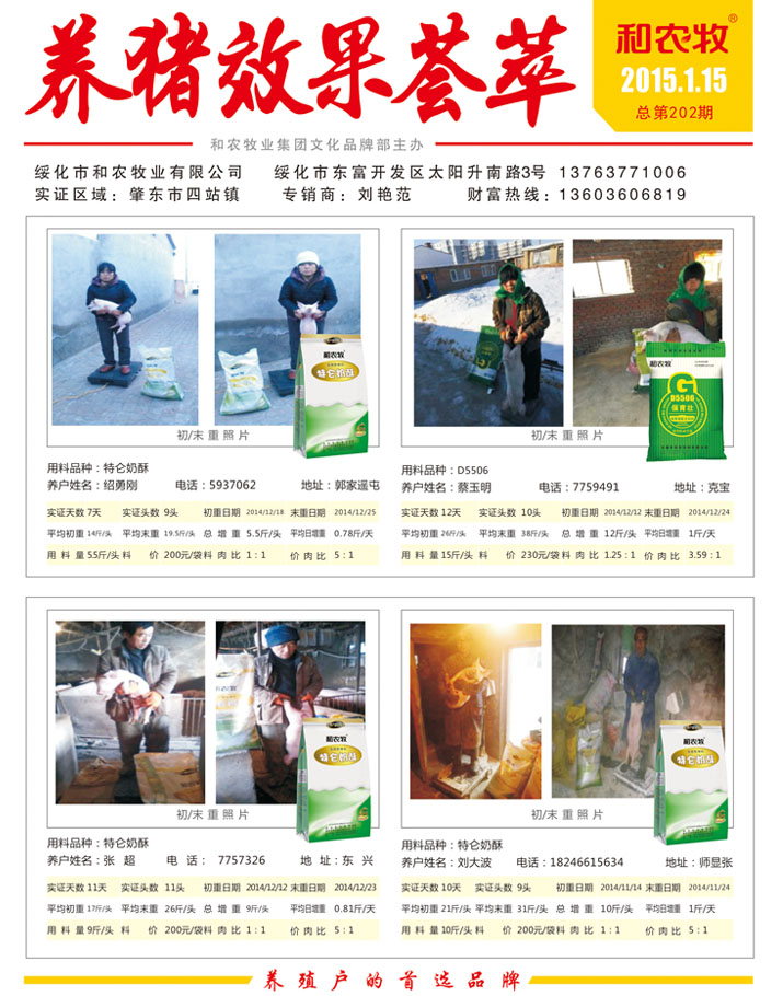 綏化市和農(nóng)牧業(yè)有限公司 綏化市東富開(kāi)發(fā)區(qū)太陽(yáng)升南路3號(hào) 13763771006 實(shí)證區(qū)域:肇東市東發(fā)鄉(xiāng) 專(zhuān)銷(xiāo)商:趙廣民 財(cái)富熱線(xiàn):15046012851 用料品種:D55...
